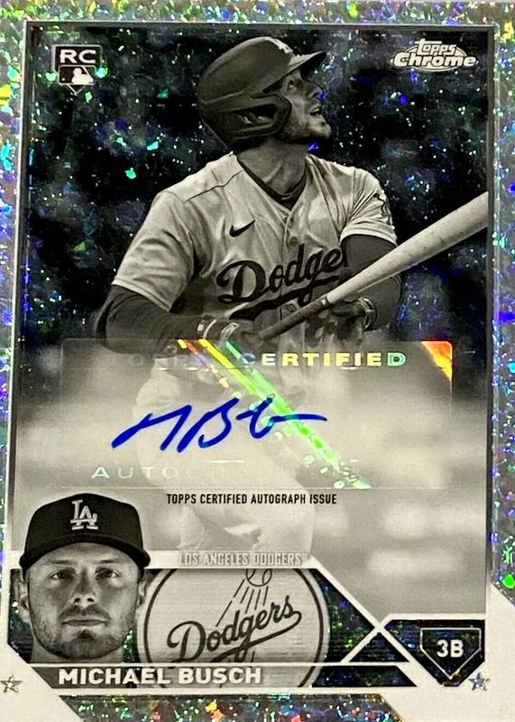 The Michael Busch 2023 Topps Chrome Update #AC-MB Autographs - Black & White Mini-Diamond Refractor Rookie card in Raw condition has not changed in price in the last 30 days and was last sold for $80.00 .