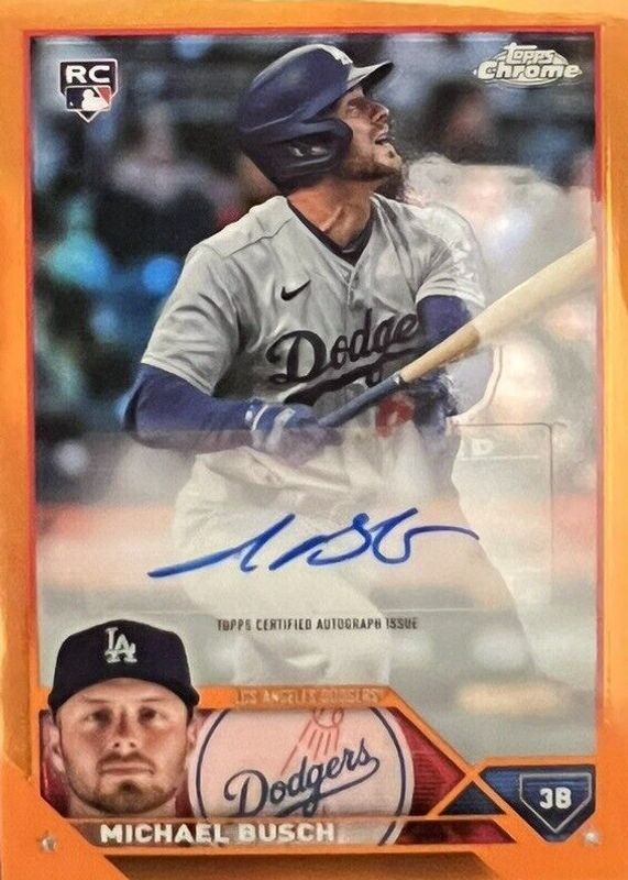 The Michael Busch 2023 Topps Chrome Update #AC-MB Autographs - Orange Refractor /25 Rookie card in Raw condition has not changed in price in the last 30 days and was last sold for $129.16 .