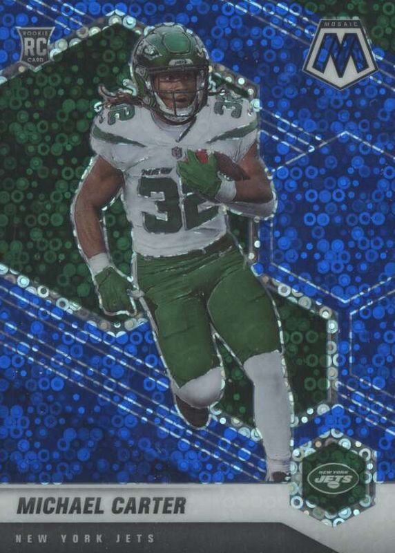 This card is 1 of 39 Michael Carter's card variations in the 2021 Mosaic set being tracked by Sports Card Investor, including Base, Choice Red & Green, Green, No Huddle, and Pink Camo.