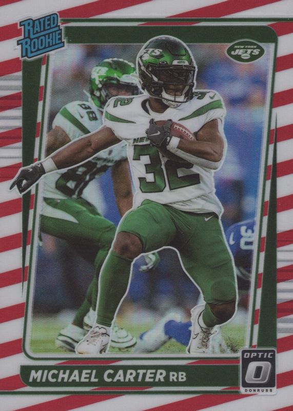 This card is 1 of 51 Michael Carter's card variations in the 2021 Optic set being tracked by Sports Card Investor, including Base, Blue Hyper, Blue Scope, Bronze, and Green Velocity.