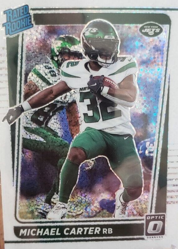 This card is 1 of 51 Michael Carter's card variations in the 2021 Optic set being tracked by Sports Card Investor, including Base, Blue Hyper, Blue Scope, Bronze, and Green Velocity.