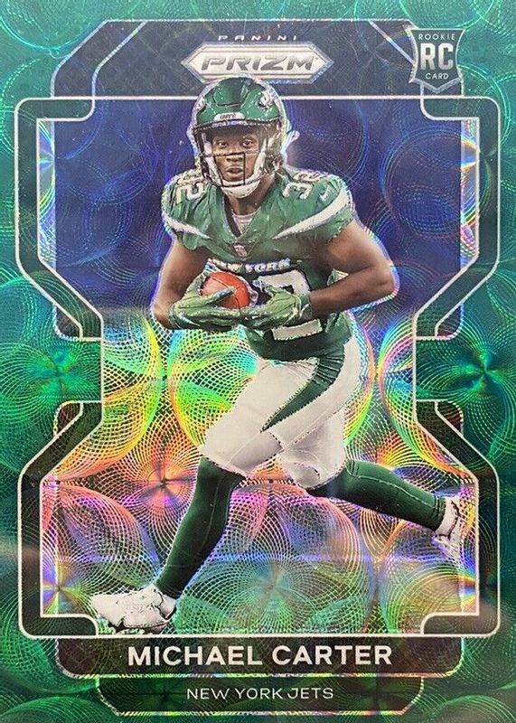 This card is 1 of 70 Michael Carter's card variations in the 2021 Prizm set being tracked by Sports Card Investor, including Base, Disco, Green, Green Ice, and Lazer.