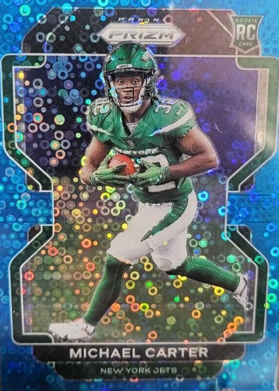 This card is 1 of 70 Michael Carter's card variations in the 2021 Prizm set being tracked by Sports Card Investor, including Base, Disco, Green, Green Ice, and Lazer.