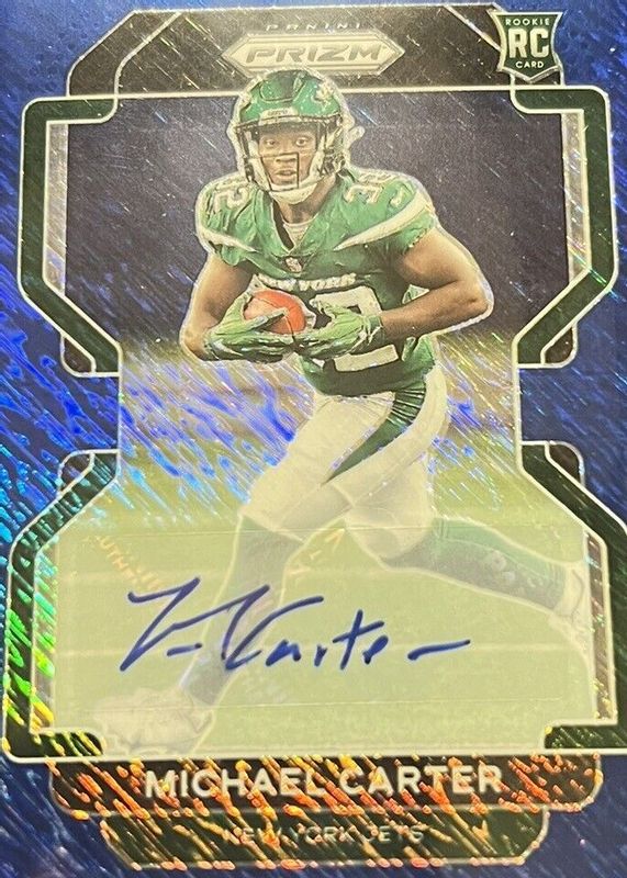 The Michael Carter 2021 Prizm #365 Rookie Autographs - Blue Shimmer /25 card in Raw condition has not changed in price in the last 30 days and was last sold for $7.00 .