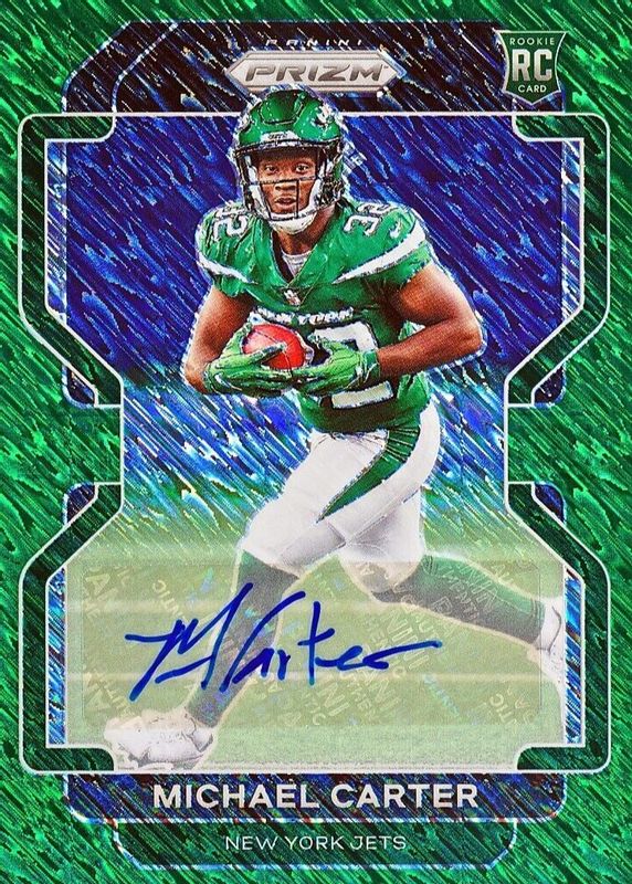 The Michael Carter 2021 Prizm #365 Rookie Autographs - Green Shimmer /5 card in Raw condition has not changed in price in the last 30 days and was last sold for $50.00 .