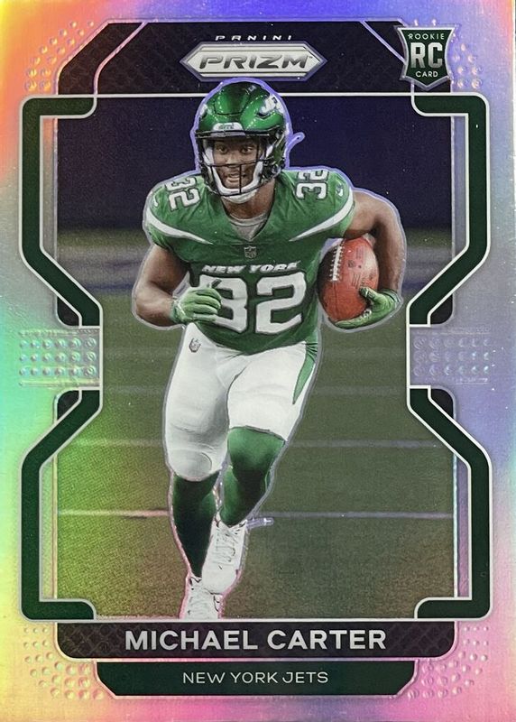 This card is 1 of 70 Michael Carter's card variations in the 2021 Prizm set being tracked by Sports Card Investor, including Base, Disco, Green, Green Ice, and Lazer.