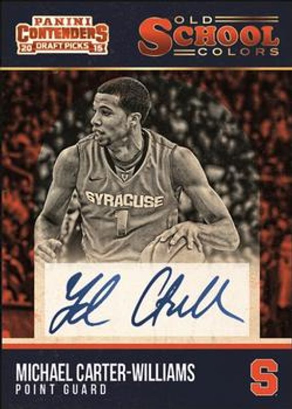 The Michael Carter-Williams 2015 Contenders Draft Picks #16 Old School Colors Signatures card is 1 of 11 Michael Carter-Williams' card variations in the 2015 Contenders Draft Picks set being tracked by Sports Card Investor, including Base, Draft Ticket /99, Season Ticket Cracked Ice /23, Championship Ticket /1, and Season Ticket Printing Plates Black /1.