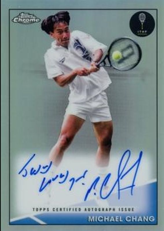The Michael Chang 2021 Topps Chrome #CA-MC Chrome Autographs /50 card is 1 of 27 Michael Chang's card variations in the 2021 Topps Chrome set being tracked by Sports Card Investor, including Base, Black & White Mini Diamond, Clay Court, Refractor, and Purple /199.