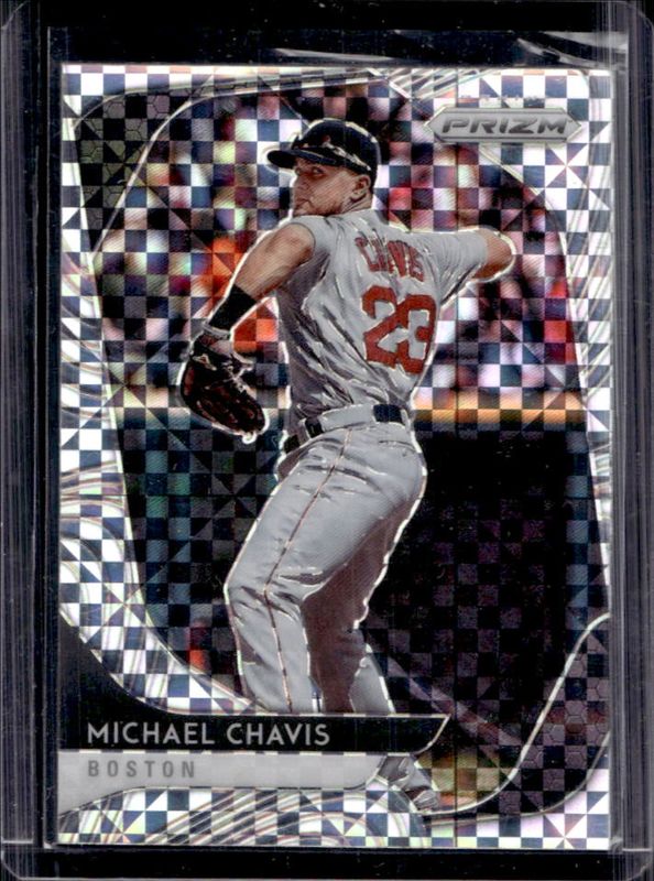 The Michael Chavis 2020 Prizm #91 Power Plaid /75 card is 1 of 42 Michael Chavis' card variations in the 2020 Prizm set being tracked by Sports Card Investor, including Base, Blue, Carolina Blue, Cosmic Haze, and Green.