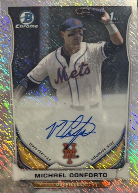 The Michael Conforto 2014 Bowman Draft #BCA-MC Chrome DP Auto - Shimmer Refractor /15 (1st) card in Raw condition has not changed in price in the last 30 days and was last sold for $13.50 .