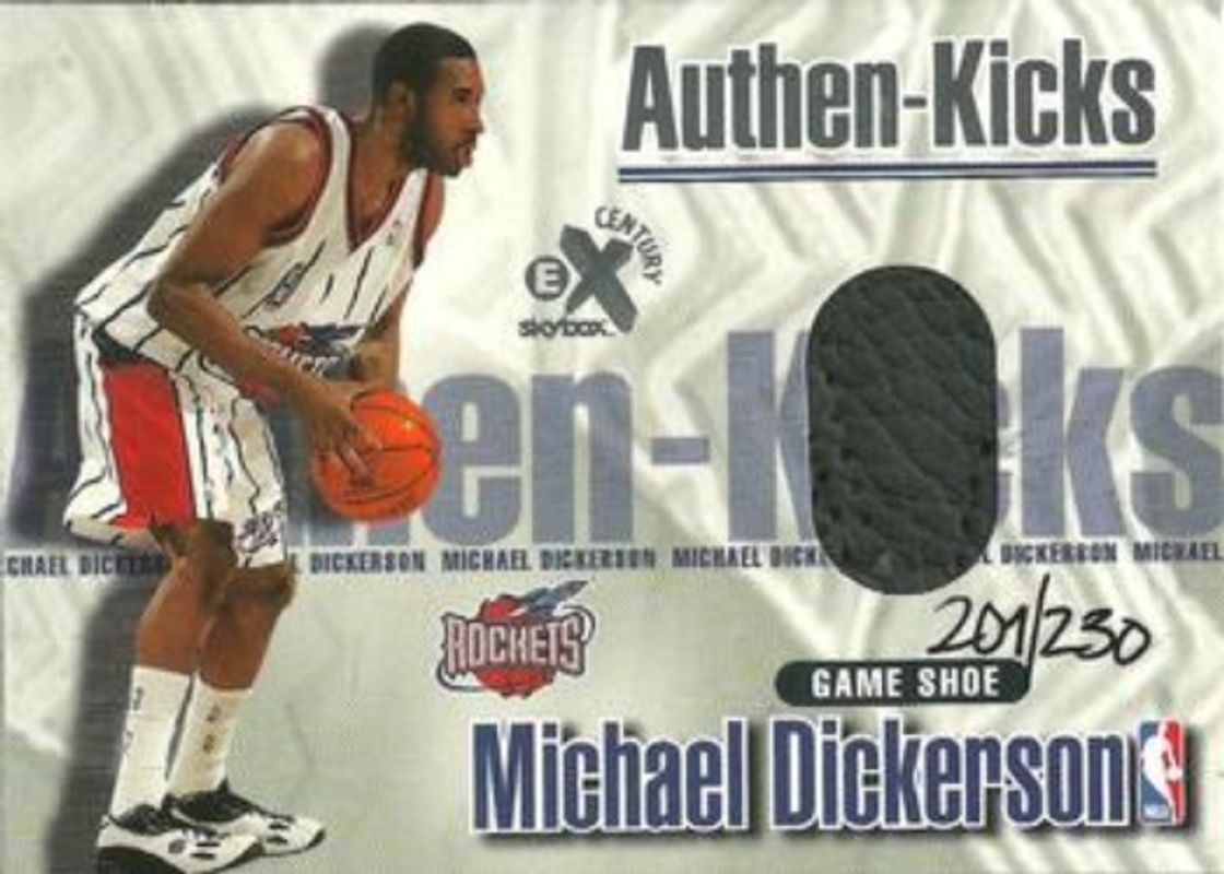 The Michael Dickerson 1998 Skybox E-X Century #6AK Authen Kicks /225 Rookie card is 1 of 6 Michael Dickerson's card variations in the 1998 Skybox E-X Century set being tracked by Sports Card Investor, including Base, Essential Credentials Future (/21), Essential Credentials Now (/70), Dunk 'N Go-Nuts, and Autographics.