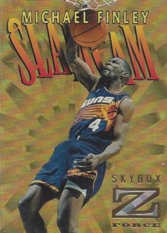 The Michael Finley 1996 Skybox Z-Force #SC2 Slam Cam card is 1 of 7 Michael Finley's card variations in the 1996 Skybox Z-Force set being tracked by Sports Card Investor, including #172 Base, #69 Base, #69 Z Cling, #SC2 Slam Cam, and Autographics Black Ink.