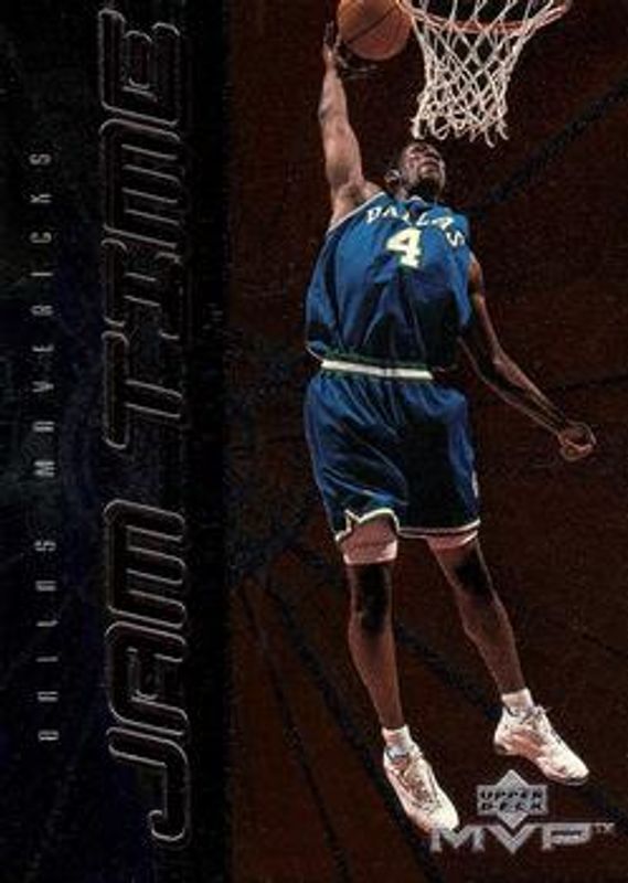 The Michael Finley 1999 Upper Deck MVP #JT9 Jam Time card is 1 of 6 Michael Finley's card variations in the 1999 Upper Deck MVP set being tracked by Sports Card Investor, including Base, Silver Script, Gold Script /100, Super Script /25, and Game Used Souvenir /1.