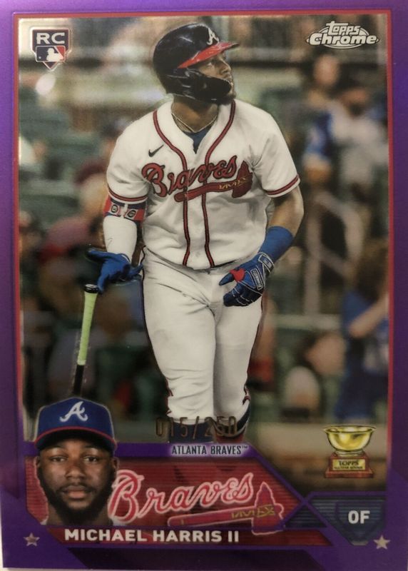 The Michael Harris II 2023 Topps Chrome #79 Purple Refractor /250 Rookie card in Raw condition has not changed in price in the last 30 days and was last sold for $5.50 .