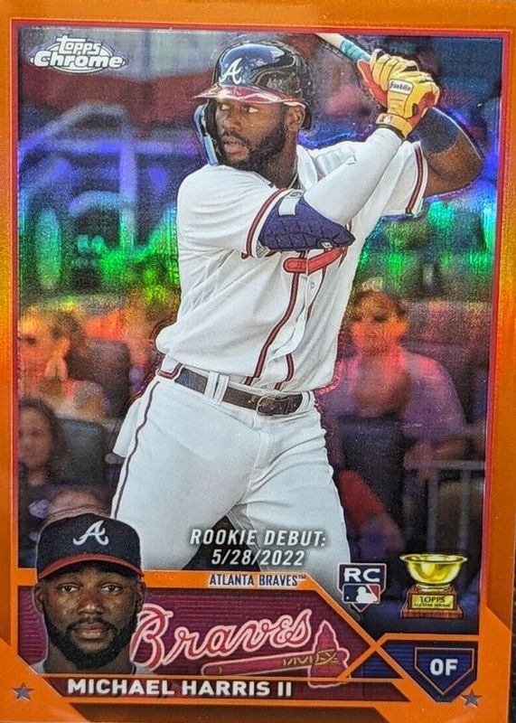 The Michael Harris II 2023 Topps Chrome Update #USC153 Rookie Debut - Orange Refractor /25 card in Raw condition has not changed in price in the last 30 days and was last sold for $26.00 .