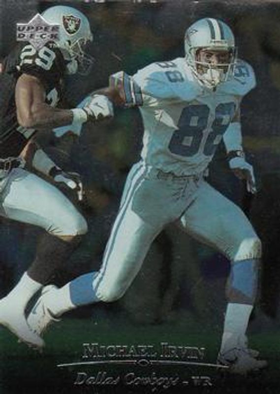 The Michael Irvin 1996 Upper Deck Silver Collection #98 Base card is 1 of 2 Michael Irvin's card variations in the 1996 Upper Deck Silver Collection set being tracked by Sports Card Investor, including All NFL Team.