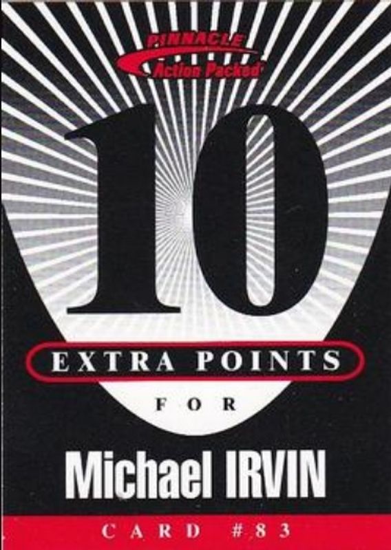 The Michael Irvin 1997 Action Packed Flagship #83 Extra Points 10 card is 1 of 10 Michael Irvin's card variations in the 1997 Action Packed Flagship set being tracked by Sports Card Investor, including #83 Base, #123 Base, #123 First Impressions, #83 First Impressions, and #83 Gold Impressions.