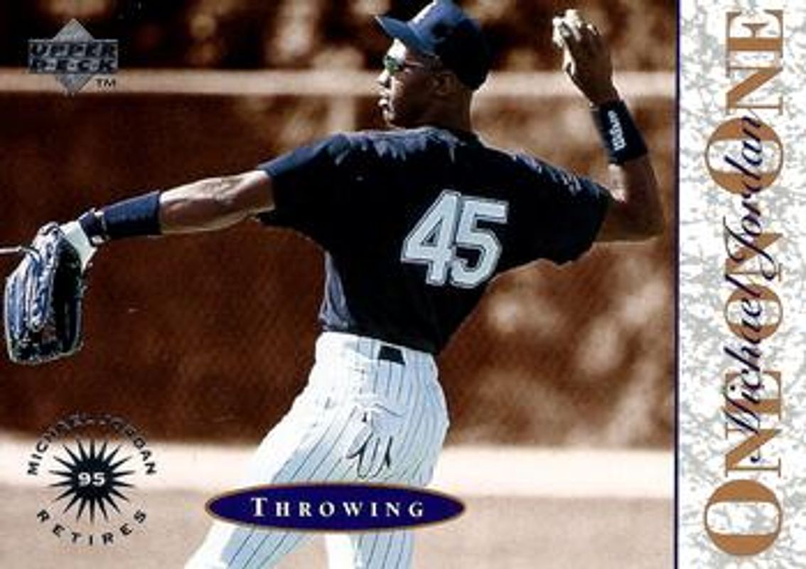 The Michael Jordan 1995 Upper Deck Minor League #1 Michael Jordan One On One card is 1 of 18 Michael Jordan's card variations in the 1995 Upper Deck Minor League set being tracked by Sports Card Investor, including #45 Base, #45 Future Stock, #MJ-1 Michael Jordan Jumbos, #MJ-2 Michael Jordan Jumbos, and #MJ-3 Michael Jordan Jumbos.