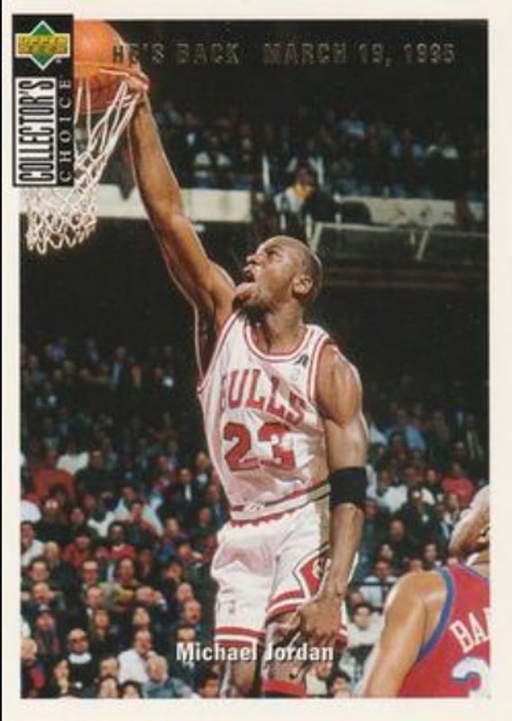 The Michael Jordan 1994 Upper Deck #240 Michael Jordan He's Back Reprints card is 1 of 28 Michael Jordan's card variations in the 1994 Upper Deck set being tracked by Sports Card Investor, including #359 Base, #37 Basketball Heroes: Michael Jordan, #38 Basketball Heroes: Michael Jordan, #39 Basketball Heroes: Michael Jordan, and #40 Basketball Heroes: Michael Jordan.