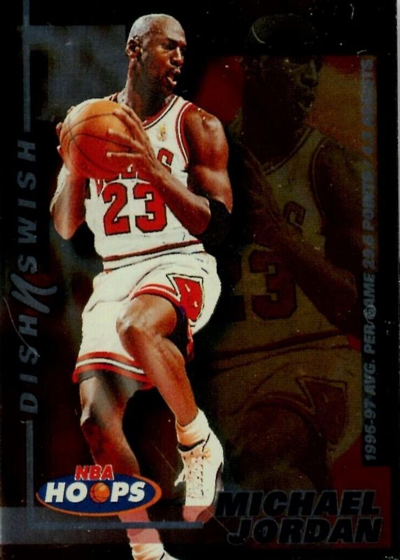 The Michael Jordan 1997 Hoops #5 Dish N Swish card in Raw condition has moved down -$12.25 (-40.8%) in the last 30 days and was last sold for $17.74 .