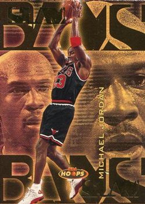 The Michael Jordan 1998 Hoops #1-SB Slam Bams /100 card is 1 of 10 Michael Jordan's card variations in the 1998 Hoops set being tracked by Sports Card Investor, including #23 Base, #23 Starting Five /5, #5-PJ Pump Up the Jam, #5PJ Pump Up the Jam, and #13-SO Shout Outs.