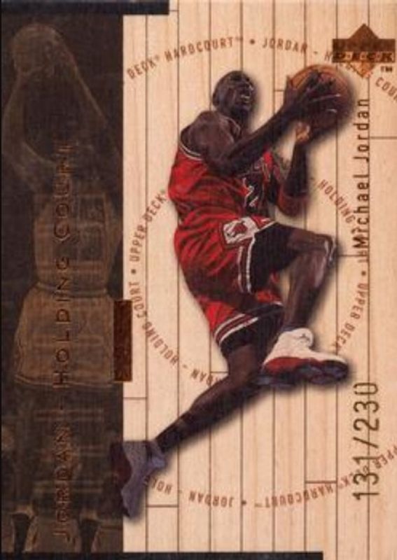 The Michael Jordan 1998 Upper Deck Hardcourt #J30 Jordan Holding Court Bronze /230 card is 1 of 10 Michael Jordan's card variations in the 1998 Upper Deck Hardcourt set being tracked by Sports Card Investor, including #23 Base, #23-A Base, #23 Home Court Advantage, #23 Home Court Advantage Plus /500, and Michael Jordan Box Topper.