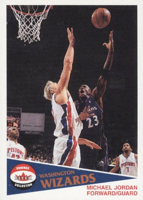 This card is 1 of 5 Michael Jordan's card variations in the 2001 Fleer Shoebox set being tracked by Sports Card Investor, including Base, Footprints Retail, NBA Flight School, and Sole of the Game.