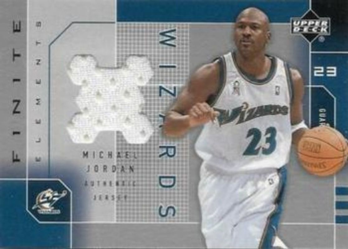 The Michael Jordan 2002 Upper Deck Finite #MJ-J Elements Jerseys card is 1 of 7 Michael Jordan's card variations in the 2002 Upper Deck Finite set being tracked by Sports Card Investor, including #200 Base /900, #150 Base /900, #180 Base /900, #100 Base /900, and #MJ-A Signatures /80.