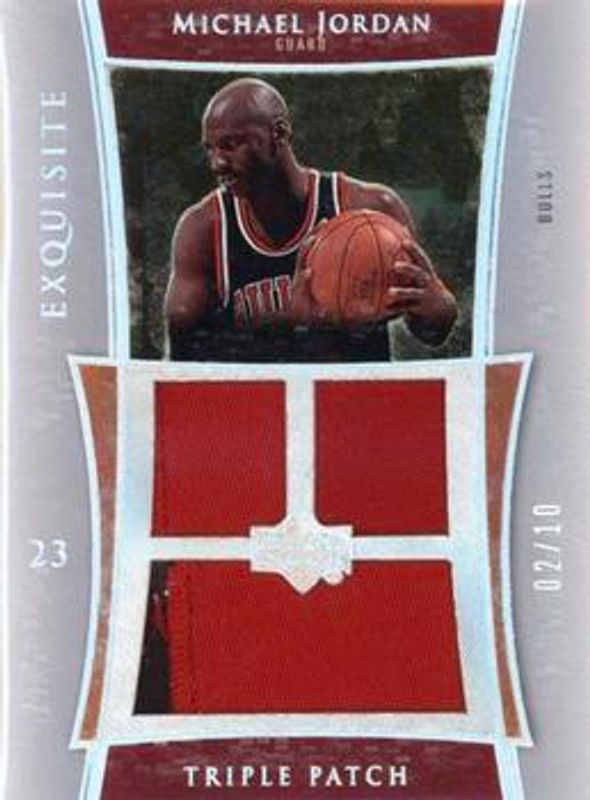 The Michael Jordan 2004 Upper Deck Exquisite Collection #E3P-MJ2 Patches Triple /10 card is 1 of 26 Michael Jordan's card variations in the 2004 Upper Deck Exquisite Collection set being tracked by Sports Card Investor, including Base /225, Gold /25, Platinum /1, Patches Autographs /100, and Limited Logos /50.