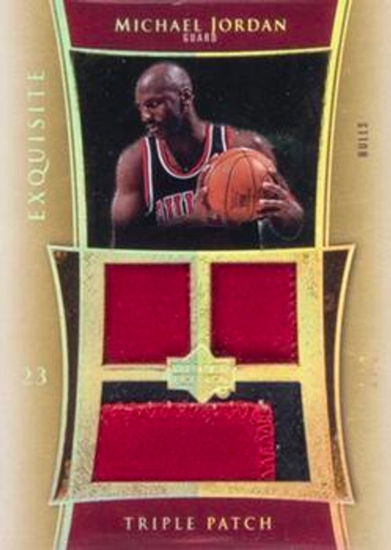 The Michael Jordan 2004 Upper Deck Exquisite Collection #E3P-MJ2 Patches Triple Parallel /3 card is 1 of 26 Michael Jordan's card variations in the 2004 Upper Deck Exquisite Collection set being tracked by Sports Card Investor, including Base /225, Gold /25, Platinum /1, Patches Autographs /100, and Limited Logos /50.