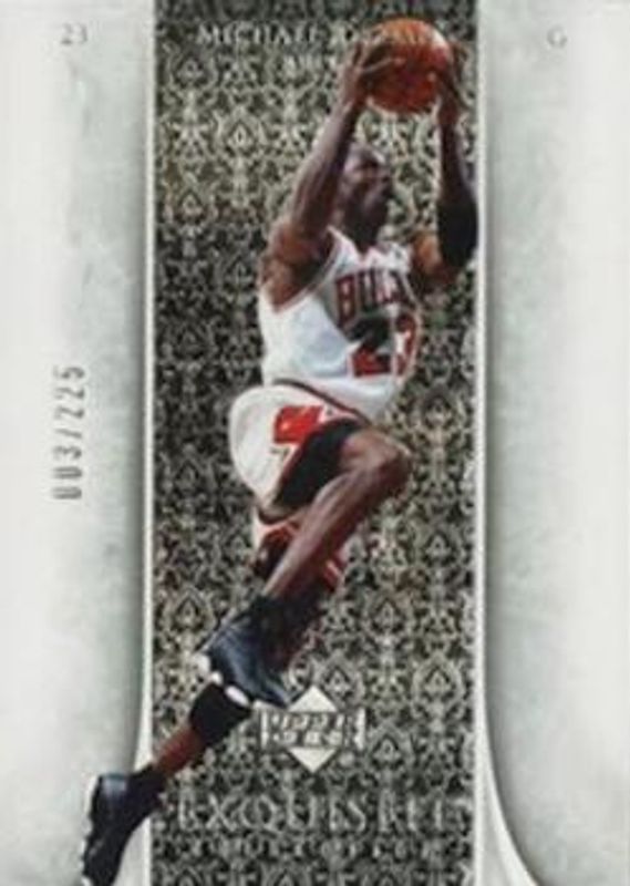 The Michael Jordan 2005 Upper Deck Exquisite Collection #5 Base /225 card is 1 of 22 Michael Jordan's card variations in the 2005 Upper Deck Exquisite Collection set being tracked by Sports Card Investor, including Gold /25, Rainbow /1, Autographs Patches /100, Limited Logos /50, and Enshrinements /25.