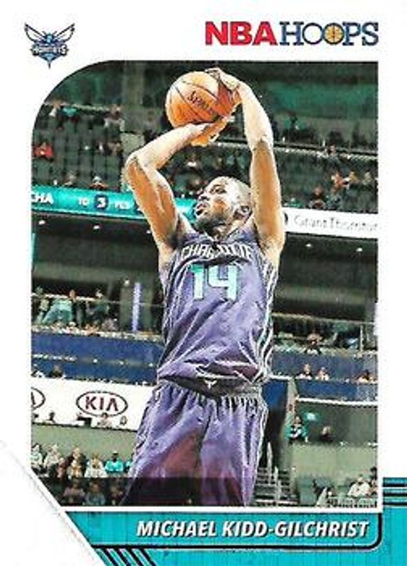 The Michael Kidd-Gilchrist 2019 Hoops #21 Base card is 1 of 20 Michael Kidd-Gilchrist's card variations in the 2019 Hoops set being tracked by Sports Card Investor, including Premium Box Set /199, Black Artist's Proof /1, Blue, Neon Green, and Purple.