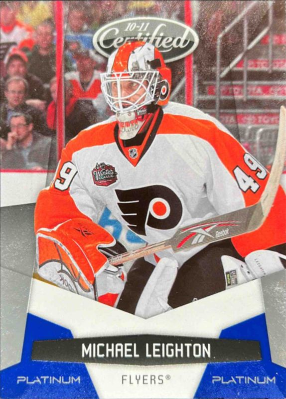 The Michael Leighton 2010 Certified #110 Platinum Blue /250 card is 1 of 27 Michael Leighton's card variations in the 2010 Certified set being tracked by Sports Card Investor, including Base /799, Platinum Red /999, Mirror Red /100, Mirror Blue /50, and Mirror Blue Signatures /50.