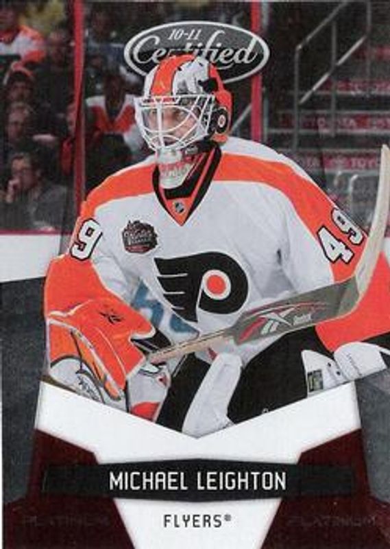 The Michael Leighton 2010 Certified #110 Platinum Red /999 card is 1 of 27 Michael Leighton's card variations in the 2010 Certified set being tracked by Sports Card Investor, including Base /799, Platinum Blue /250, Mirror Red /100, Mirror Blue /50, and Mirror Blue Signatures /50.