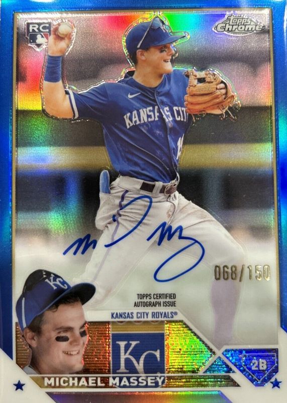 The Michael Massey (Royals) 2023 Topps Chrome #RA-MM Rookie Autographs - Blue Refractor /150 card in Raw condition has moved up $0.76 (+33.9%) in the last 30 days and was last sold for $3.00 .