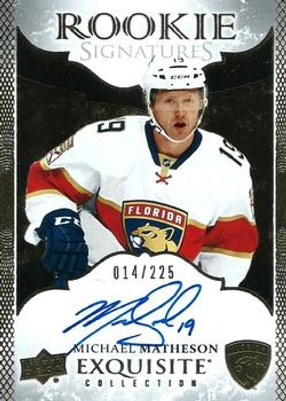 The Michael Matheson 2016 Upper Deck Ice #ERS-MI 2016 Upper Deck Exquisite Collection Rookie Signatures /49 card is 1 of 8 Michael Matheson's card variations in the 2016 Upper Deck Ice set being tracked by Sports Card Investor, including Base /1299, Ice Premieres die-cut /999, 2016 Upper Deck Exquisite Collection Rookies /299, Ice Premieres Autographs /299, and 2016 Upper Deck Exquisite Collection Rookies Spectrum /39.