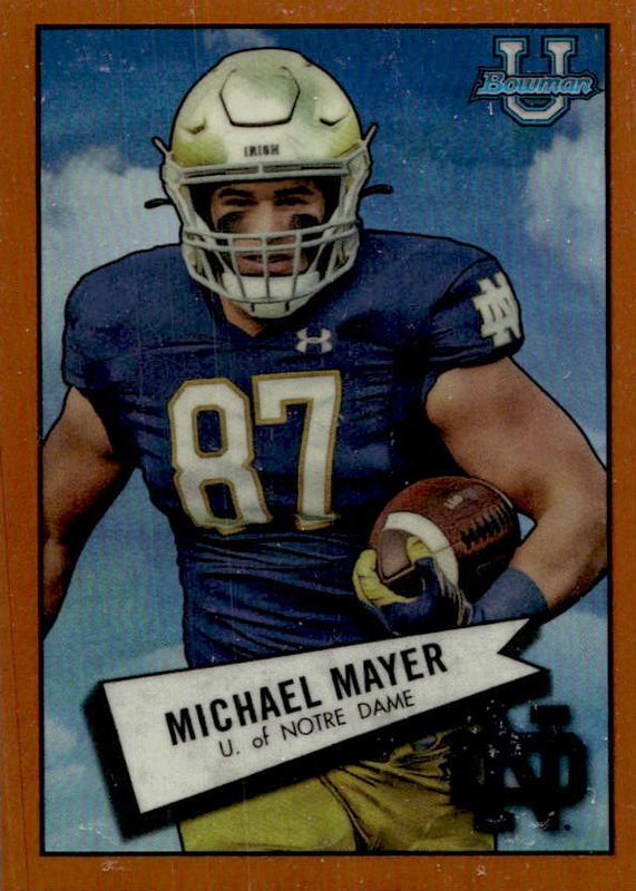 This card is 1 of 41 Michael Mayer's card variations in the 2022 Bowman Chrome University set being tracked by Sports Card Investor, including Prospects (1st), Prospects - Pink Refractor (1st), Prospects - Purple Shimmer Refractor (1st), Prospects - Refractor (1st), and Prospects - Purple Mini-Diamond Refractor /399 (1st).