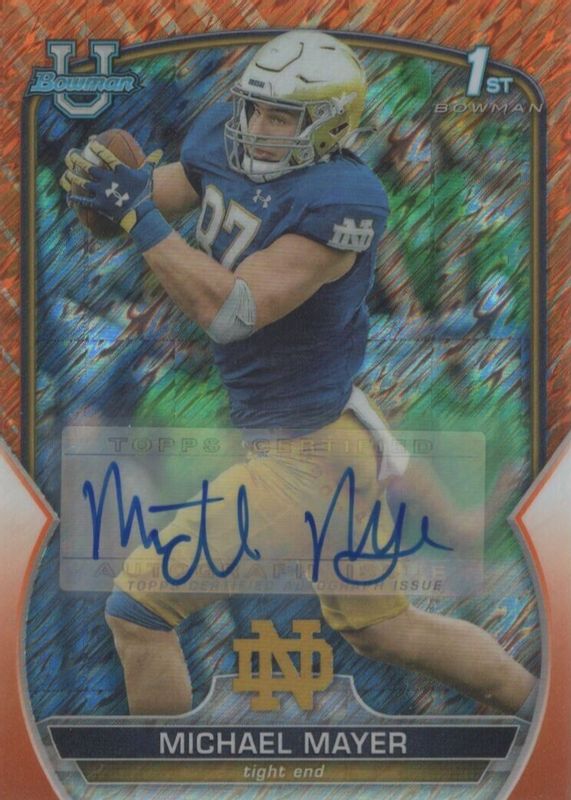This card is 1 of 41 Michael Mayer's card variations in the 2022 Bowman Chrome University set being tracked by Sports Card Investor, including Prospects (1st), Prospects - Pink Refractor (1st), Prospects - Purple Shimmer Refractor (1st), Prospects - Refractor (1st), and Prospects - Purple Mini-Diamond Refractor /399 (1st).