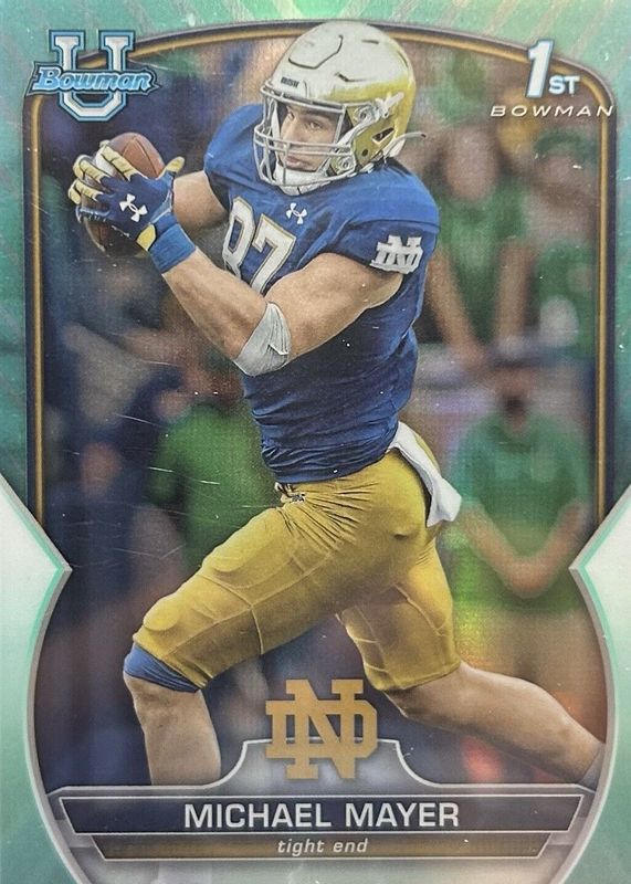 This card is 1 of 41 Michael Mayer's card variations in the 2022 Bowman Chrome University set being tracked by Sports Card Investor, including Prospects (1st), Prospects - Pink Refractor (1st), Prospects - Purple Shimmer Refractor (1st), Prospects - Refractor (1st), and Prospects - Purple Mini-Diamond Refractor /399 (1st).