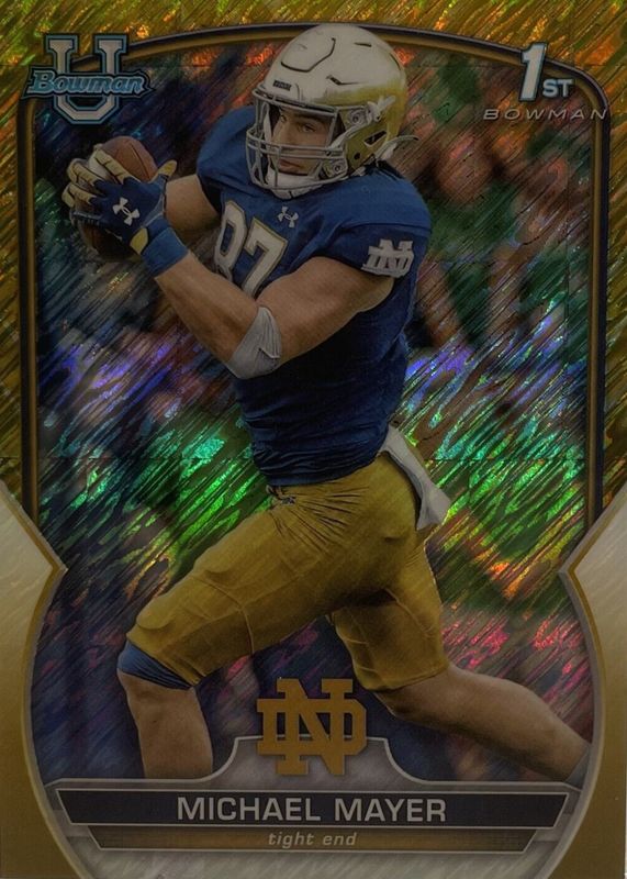 This card is 1 of 41 Michael Mayer's card variations in the 2022 Bowman Chrome University set being tracked by Sports Card Investor, including Prospects (1st), Prospects - Pink Refractor (1st), Prospects - Purple Shimmer Refractor (1st), Prospects - Refractor (1st), and Prospects - Purple Mini-Diamond Refractor /399 (1st).