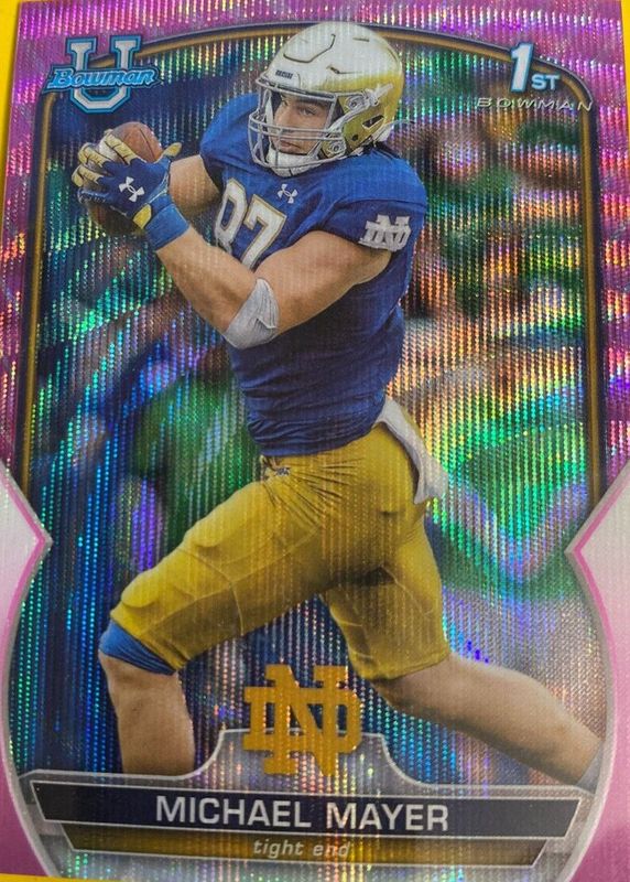 This card is 1 of 41 Michael Mayer's card variations in the 2022 Bowman Chrome University set being tracked by Sports Card Investor, including Prospects (1st), Prospects - Pink Refractor (1st), Prospects - Purple Shimmer Refractor (1st), Prospects - Refractor (1st), and Prospects - Purple Mini-Diamond Refractor /399 (1st).