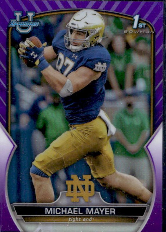 This card is 1 of 41 Michael Mayer's card variations in the 2022 Bowman Chrome University set being tracked by Sports Card Investor, including Prospects (1st), Prospects - Pink Refractor (1st), Prospects - Purple Shimmer Refractor (1st), Prospects - Refractor (1st), and Prospects - Purple Mini-Diamond Refractor /399 (1st).