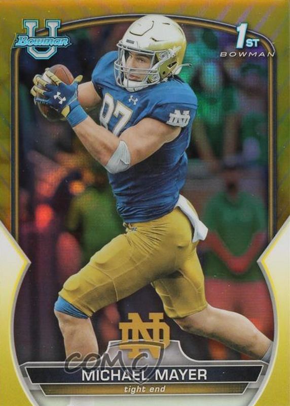 This card is 1 of 41 Michael Mayer's card variations in the 2022 Bowman Chrome University set being tracked by Sports Card Investor, including Prospects (1st), Prospects - Pink Refractor (1st), Prospects - Purple Shimmer Refractor (1st), Prospects - Refractor (1st), and Prospects - Purple Mini-Diamond Refractor /399 (1st).
