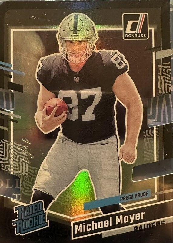 This card is 1 of 51 Michael Mayer's card variations in the 2023 Donruss set being tracked by Sports Card Investor, including Base, Aqueous Test, Canvas, Jersey Number (/87), and No Name.