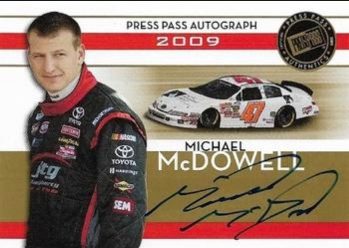 The Michael McDowell 2009 Press Pass Autographs - Gold card is 1 of 19 Michael McDowell's card variations in the 2009 Press Pass set being tracked by Sports Card Investor, including Base, Blue, Gold, Gold Holofoil /100, and eBay Previews /1.