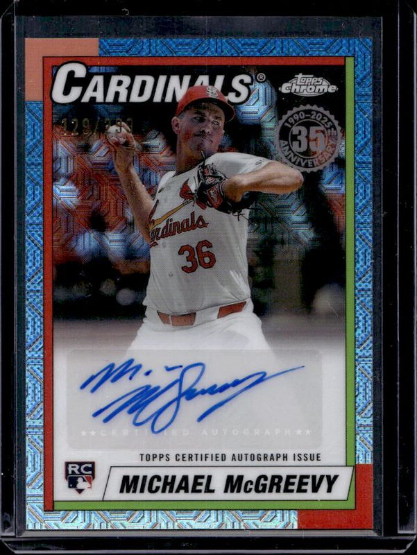 The Michael McGreevy 2025 Topps #90CA-MMY 1990 Baseball Chrome Silver Pack Autographs (Series 1) Rookie card is 1 of 101 Michael McGreevy's card variations in the 2025 Topps set being tracked by Sports Card Investor, including Base, Aqua Holo Foil, Diamante Foil, Holo Foil, and Pink Diamante Foil.