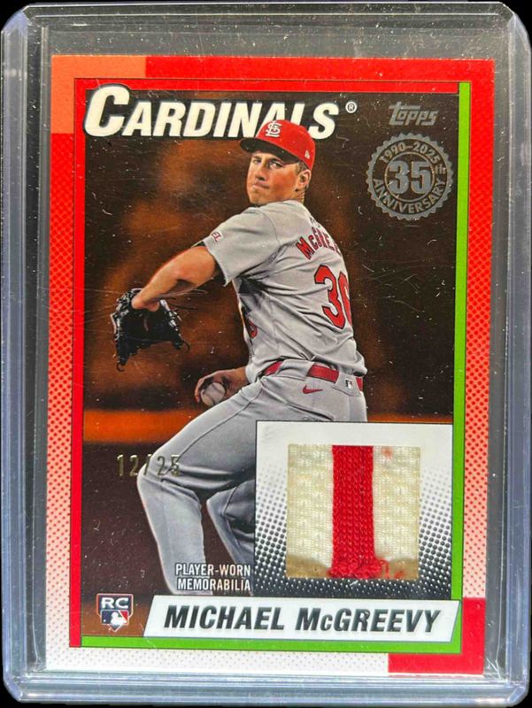 The Michael McGreevy 2025 Topps #90R2-MMC 1990 Baseball Relics (Series Two) - Orange /25 Rookie card is 1 of 101 Michael McGreevy's card variations in the 2025 Topps set being tracked by Sports Card Investor, including Base, Aqua Holo Foil, Diamante Foil, Holo Foil, and Pink Diamante Foil.