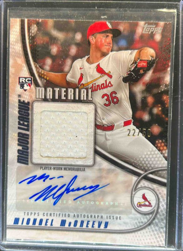The Michael McGreevy 2025 Topps #MLMA2-MMC Major League Material Autographs (Series Two) /50 Rookie card is 1 of 101 Michael McGreevy's card variations in the 2025 Topps set being tracked by Sports Card Investor, including Base, Aqua Holo Foil, Diamante Foil, Holo Foil, and Pink Diamante Foil.