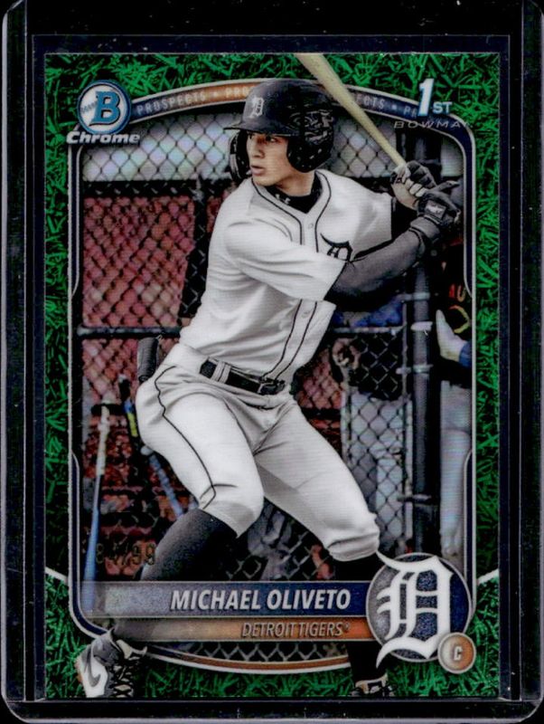 The Michael Oliveto 2025 Bowman Draft #BDC-156 Chrome - Green Grass Refractor /99 card is 1 of 86 Michael Oliveto's card variations in the 2025 Bowman Draft set being tracked by Sports Card Investor, including Base, Chrome, Chrome - Lazer Refractor, Chrome - Refractor, and Chrome - Sky Blue Refractor.