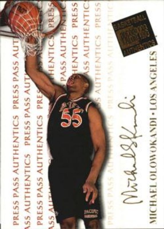 The Michael Olowokandi 1998 Press Pass Authentics #45 Base Rookie card is 1 of 9 Michael Olowokandi's card variations in the 1998 Press Pass Authentics set being tracked by Sports Card Investor, including #1 Base, #45 Hang Time, #1 Hang Time, #FP10 Full Court Press, and #LC1 Lottery Club.